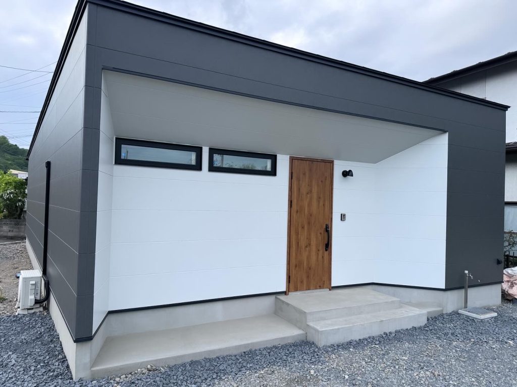 正面の外観は、グレーとホワイトの落ち着いた配色に、木目の玄関ドアが柔らかな印象を添える構成。