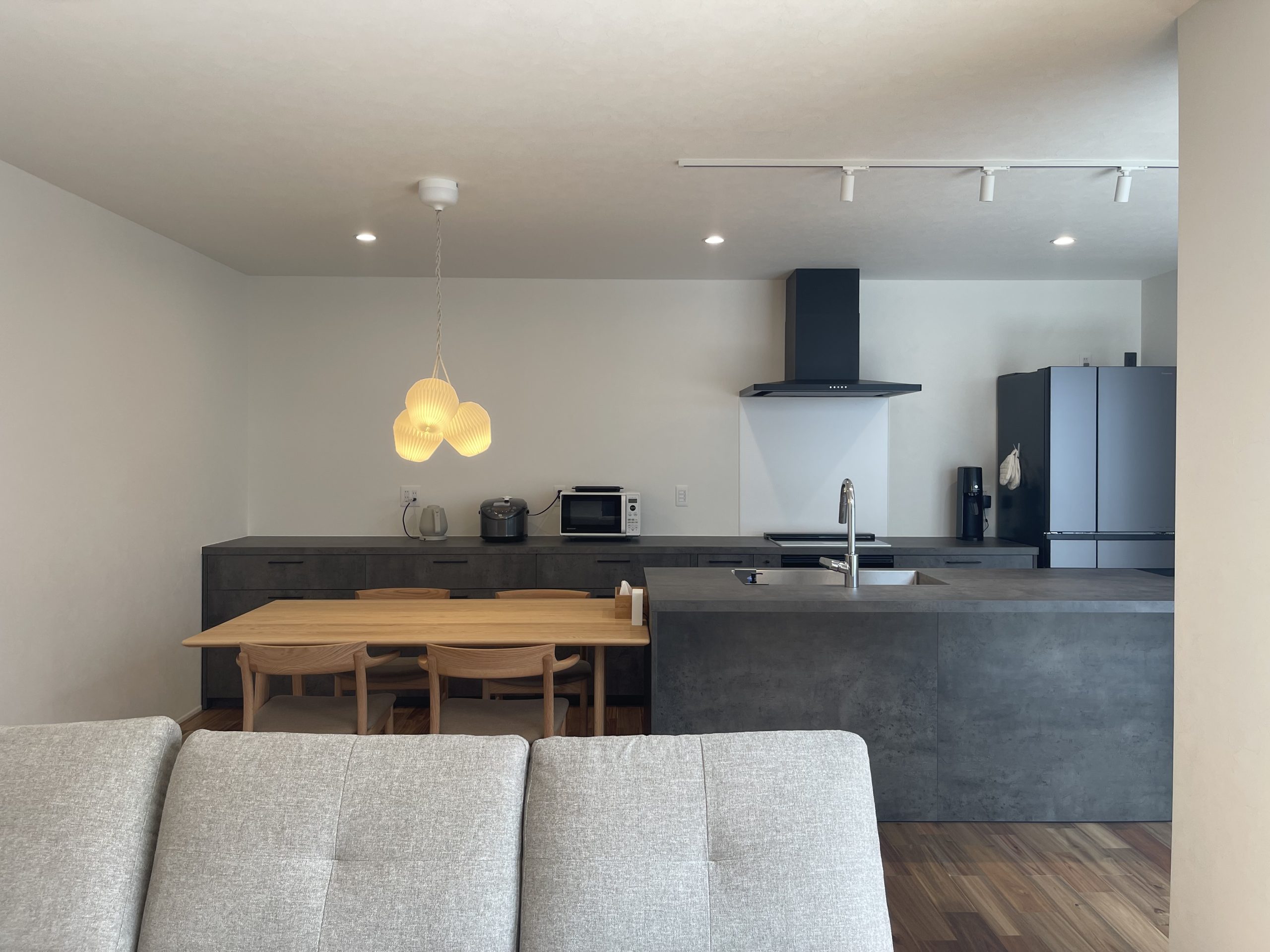 素材には落ち着いたグレーのセラミック調仕上げを用い、インテリア全体と美しく調和。