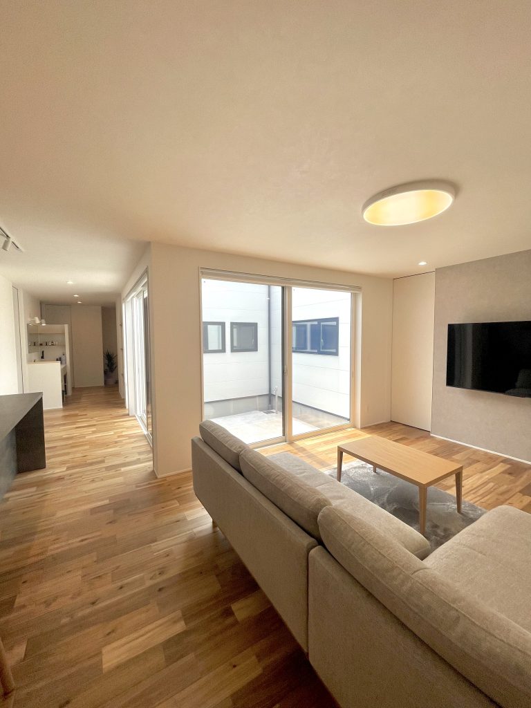 大きな開口から差し込む光が、無垢材の床にやさしく広がり、心地よい一体感を生み出しています。