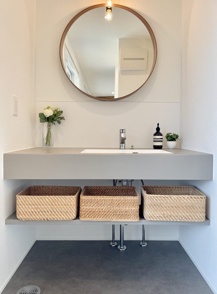 丸いミラーとグレーの洗面カウンターが印象的な、シンプルかつ上品な洗面空間。