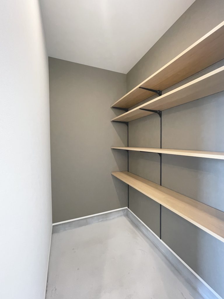 グレージュの壁にナチュラルな木製棚を合わせることで、実用性と美しさを両立しています。