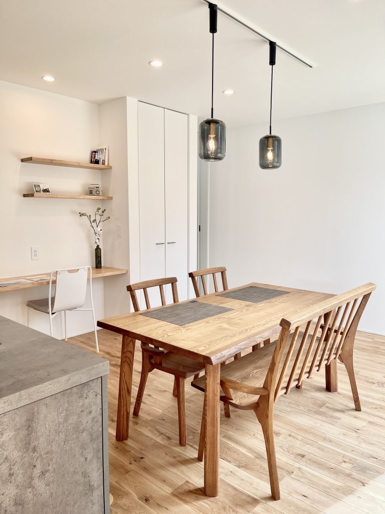 ペンダントライトや壁面の飾り棚、スタディコーナーも自然に溶け込み、家族の会話と暮らしが交差する、落ち着きのある食空間です。