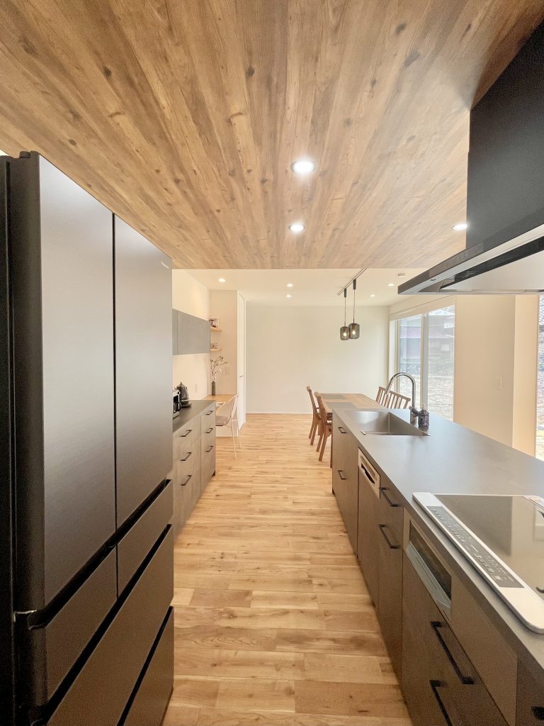 天井に施した木板がキッチン空間をやさしく包み込み、空間にリズムとアクセントを加えています。