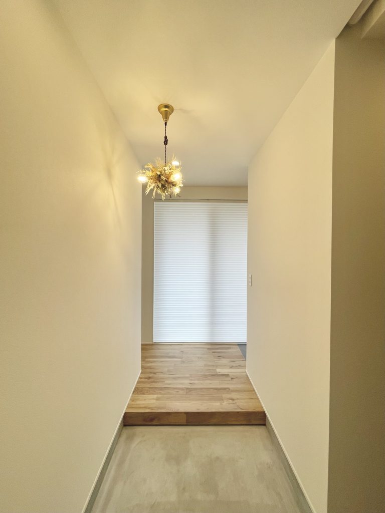 玄関を入ると、真っすぐに伸びる土間と木の床が緩やかに空間を分け、視線の奥行きを演出。