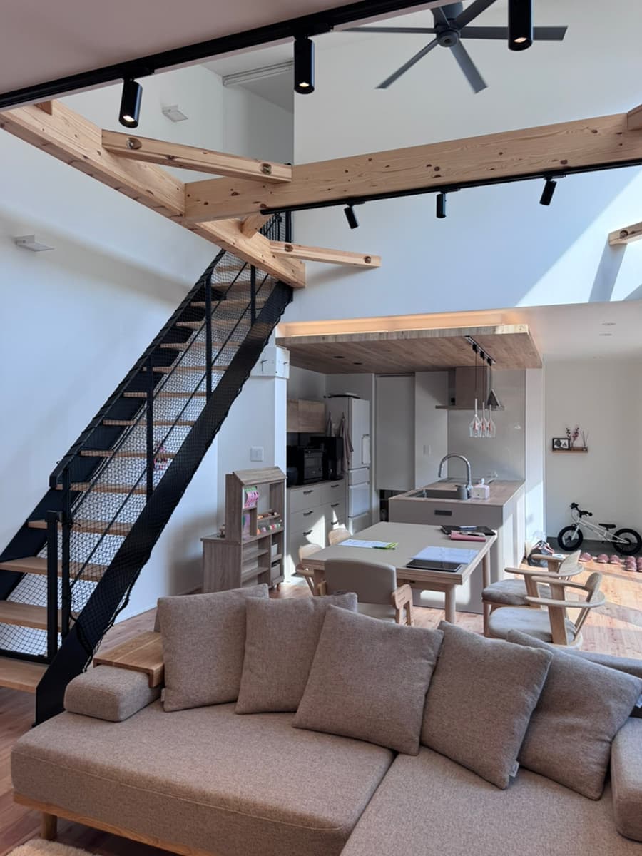 リビングに一歩足を踏み入れると広がる吹き抜け空間。黒のスチール階段がアクセントとなり、空間をスタイリッシュに引き締めています。