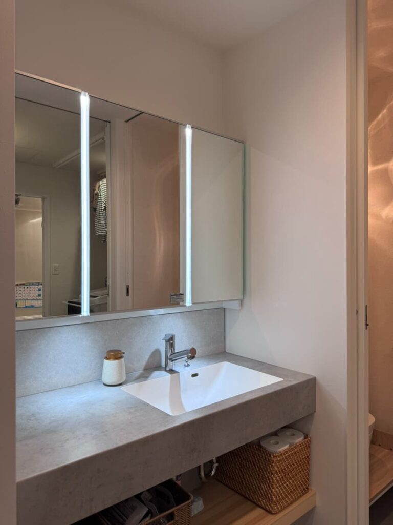 グレーの天板とスクエアなシンク、縦型のLED照明が美しい洗面スペース。シンプルながらも上質な雰囲気が漂います。